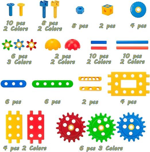- Includes: Assorted building blocks, connectors, and wheels.