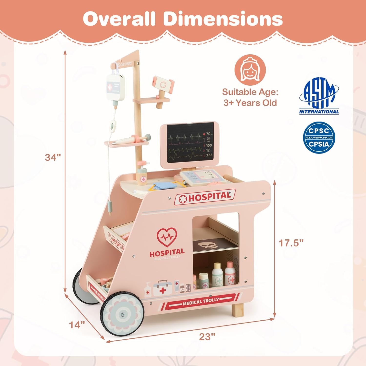- Encourage Confidence & Perfect Gift: Designed for children aged 3 years and up, this medical playset offers an interactive and educational experience that inspires young doctors. It promotes fine motor skills while helping to reduce anxiety about real medical visits. Overall Dimensions: 23" x 14" x 34" (L x W x H)