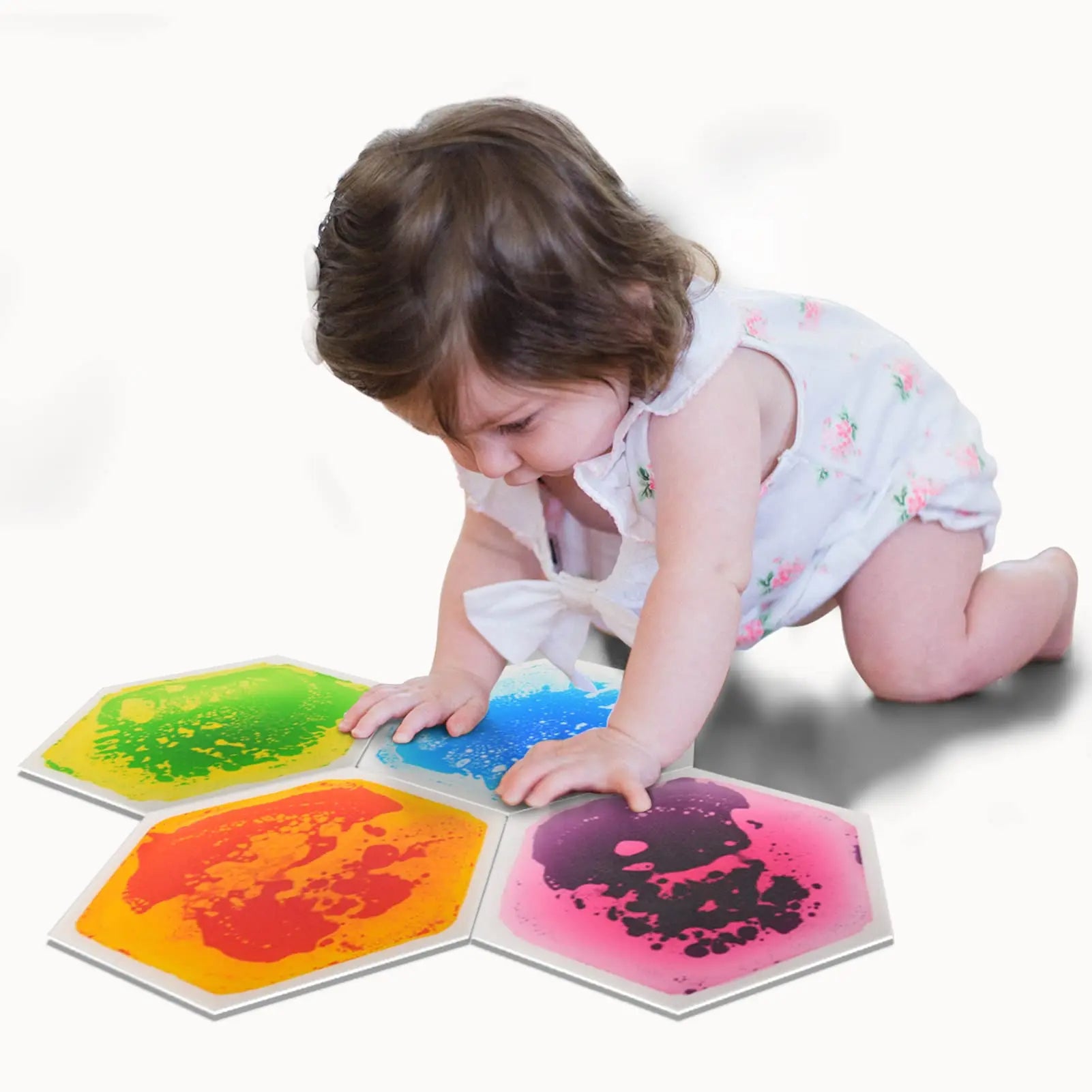 The Pressure Sensitive Color Changing Liquid Floor set with 4 hexagonal pieces is an exciting and interactive sensory toy designed to engage children through the magical transformation of colors when pressure is applied. Each tile reacts uniquely to touch, creating a visually dynamic experience that sparks curiosity and promotes hands-on learning.