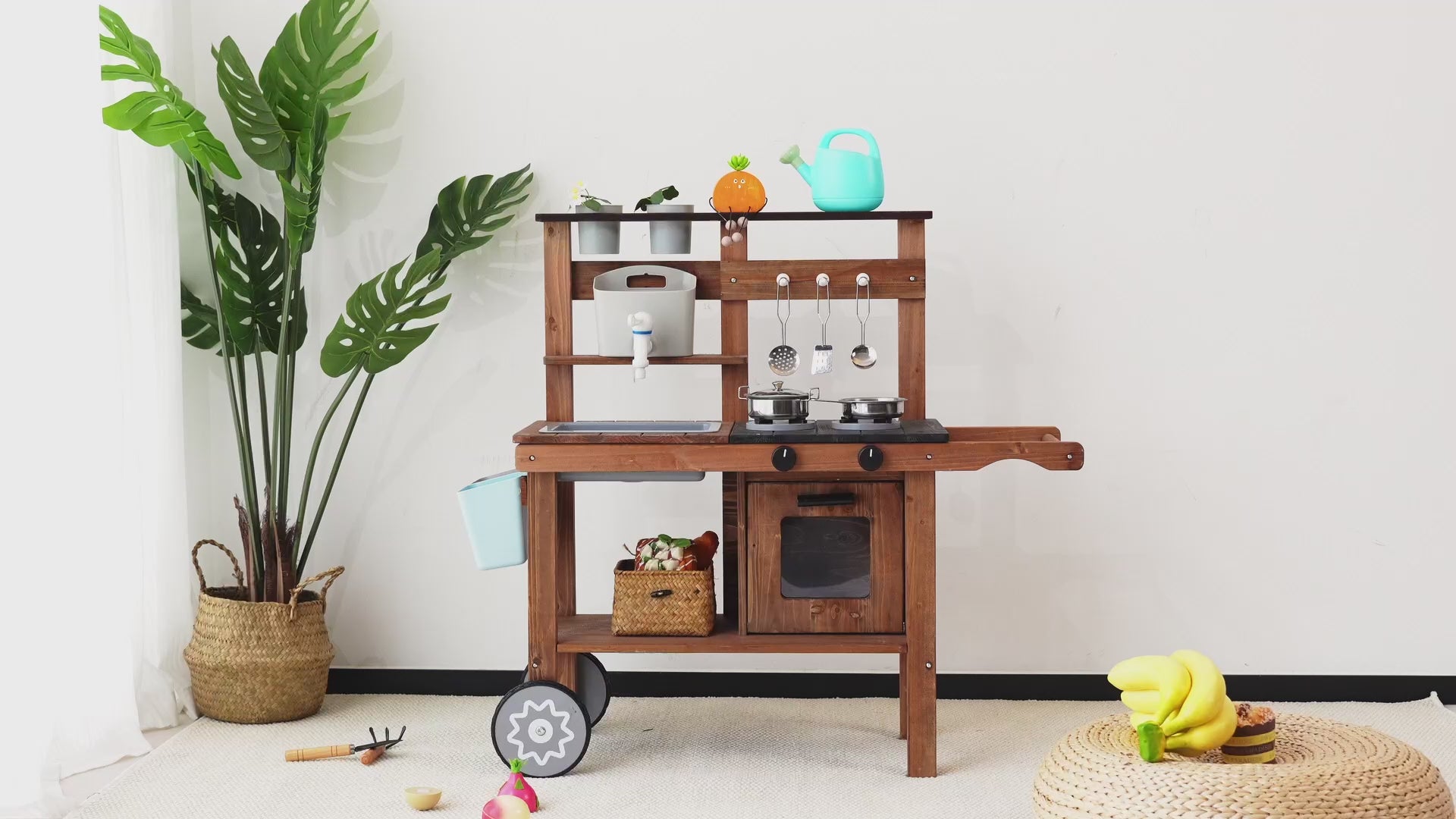 - Wooden Play Kitchen: This wooden play kitchen is made of fir, ensuring durability and sturdiness. Its design is safe and easy to clean, making it ideal for both indoor and outdoor use, including patios and playrooms.