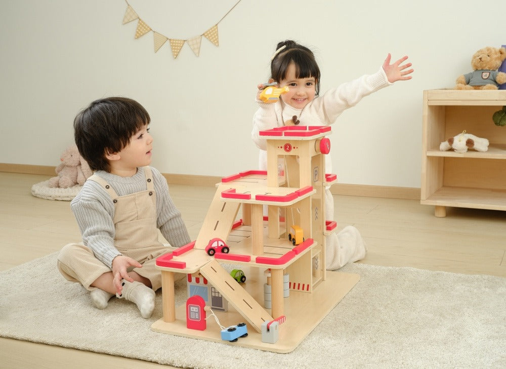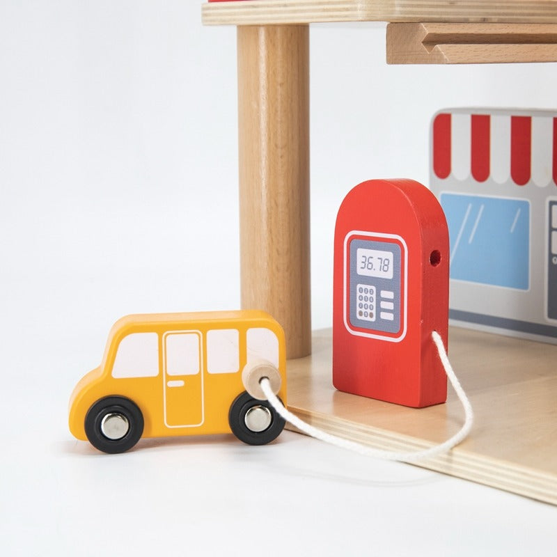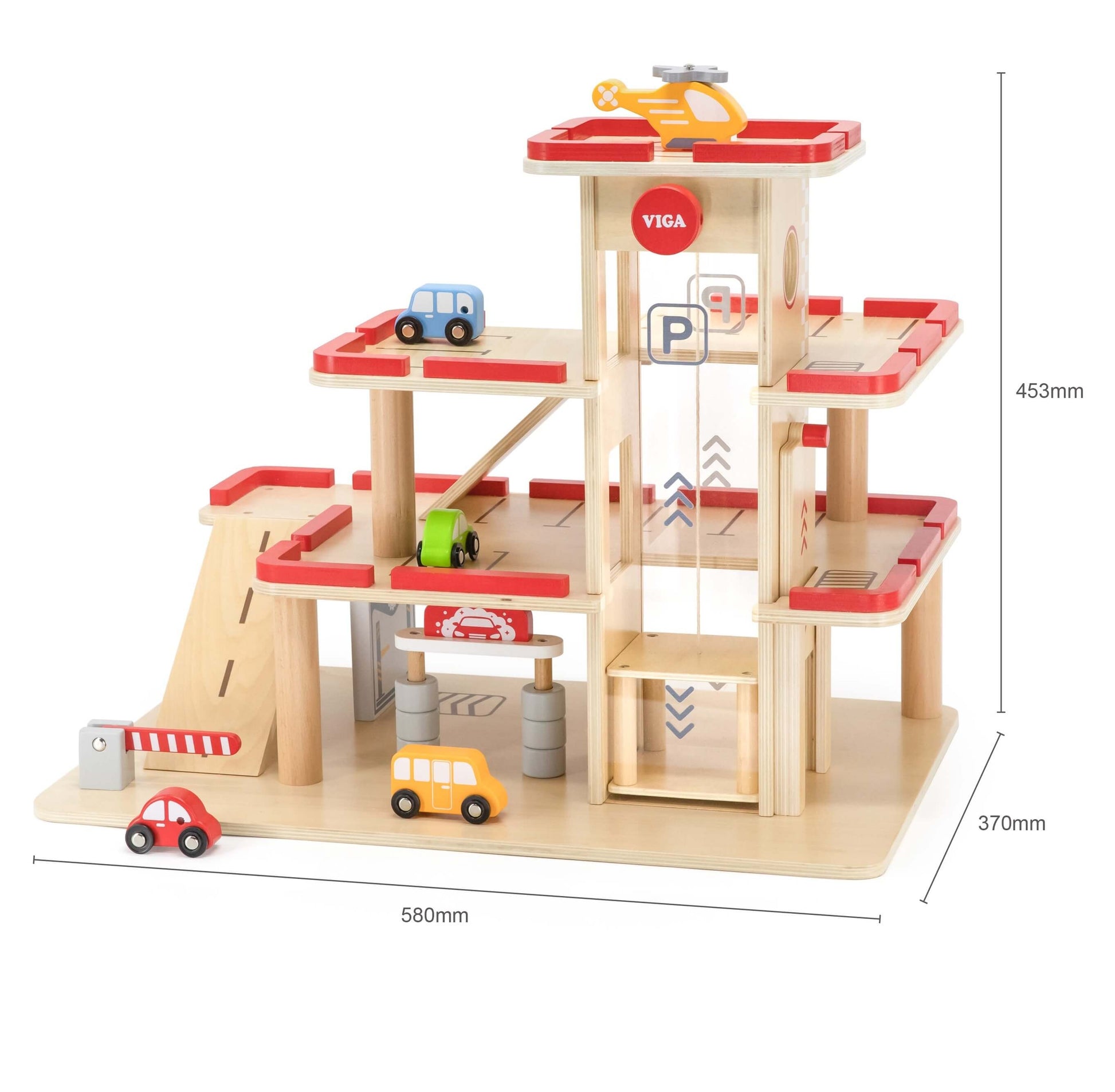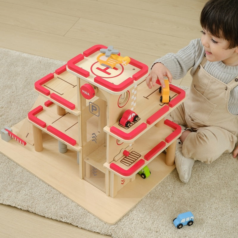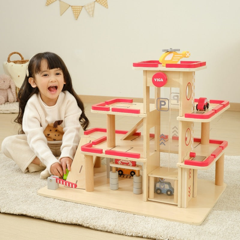 This multi-level parking and gas station is every child's dream! Kids love to wheel their little cars around a busy station while learning about transportation. Featuring a clear panoramic lift, 4 cars, and a helicopter, it’s designed for hours of action-packed fun.