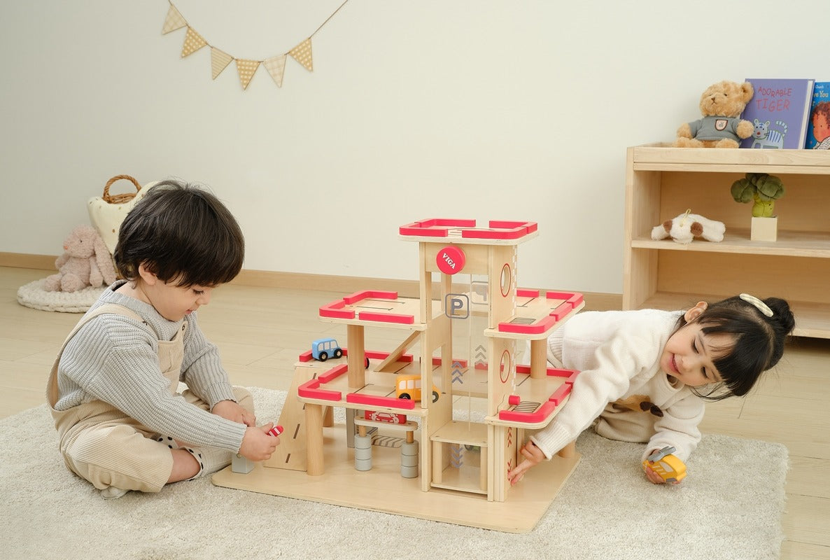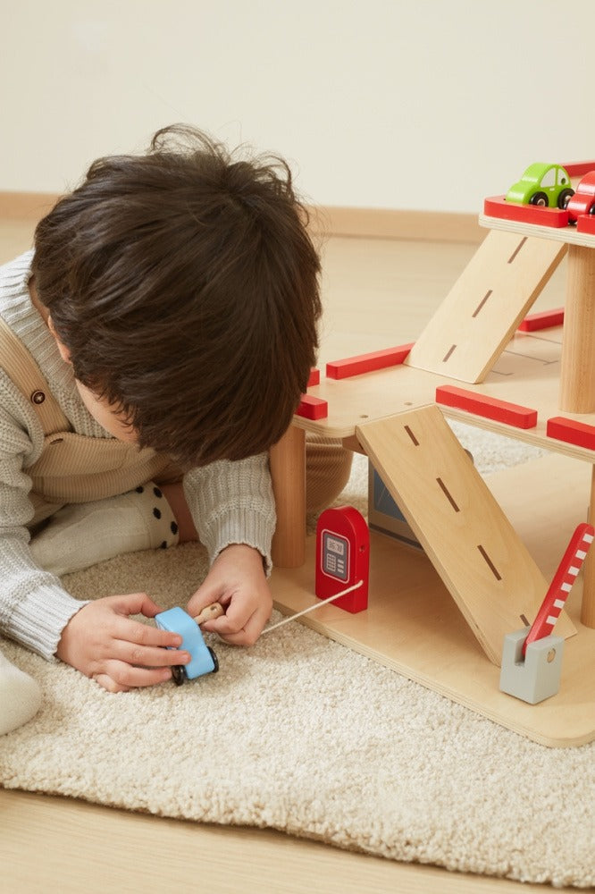 Children can watch the cars move up and down in the lift through the transparent plexiglass panels, adding excitement to every ride. A magnet holds the lift door securely at the top level, while the spacious layout and generous floor heights make it easy for children to play from all sides.
